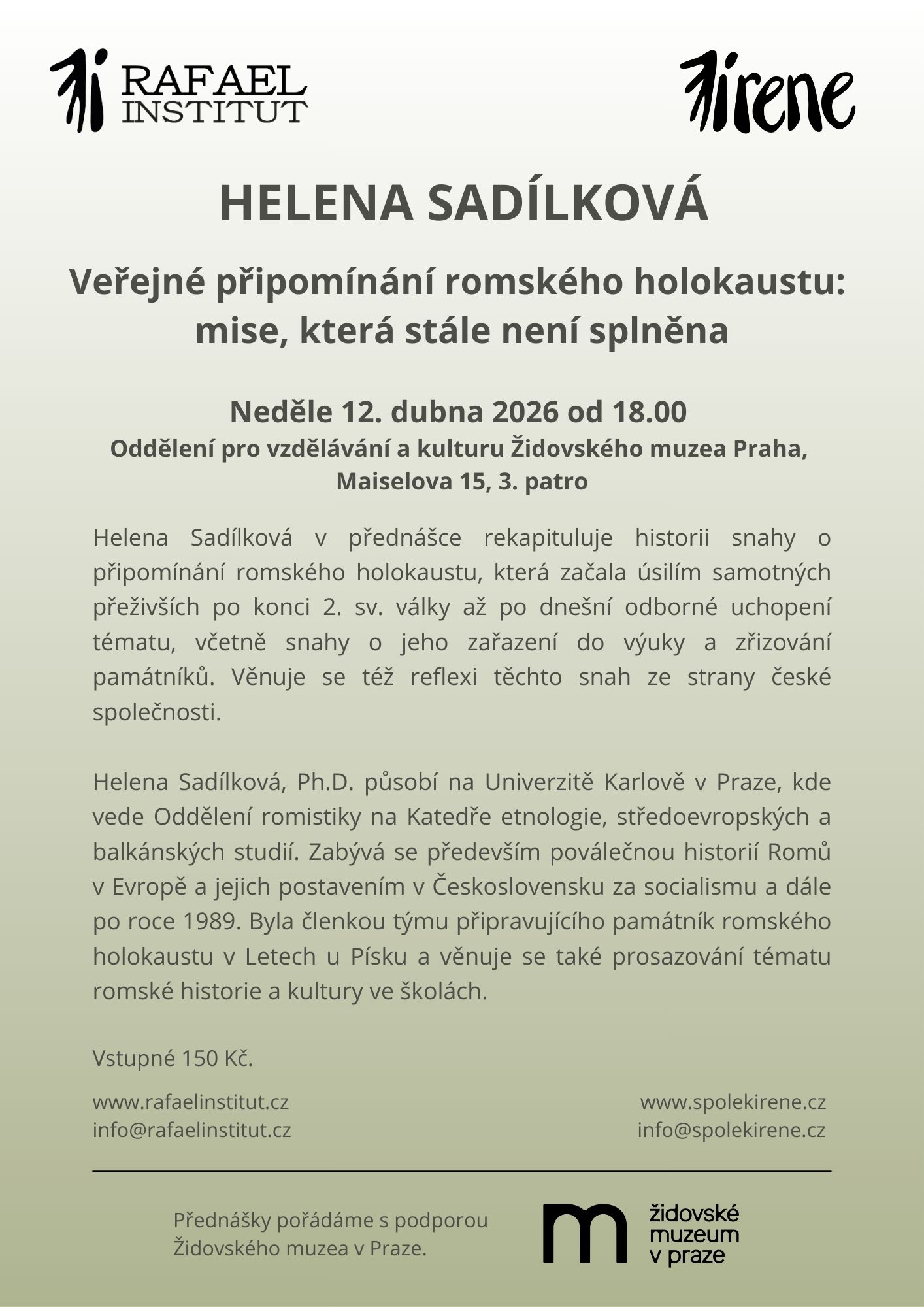 Srdečně Vás zveme na přednášku Heleny Sadílkové "Veřejné připomínání romského holokaustu: mise, která stále není splněna", která představí historii snah o připomínání romského holokaustu od poválečné iniciativy přeživších až po dnešní debaty o paměti, vzdělávání a památnících. Přednáška se uskuteční 12. dubna 2026 od 18h v prostorách Oddělení pro vzdělávání a kulturu Židovského muzea, Maiselova 15, Praha 1.