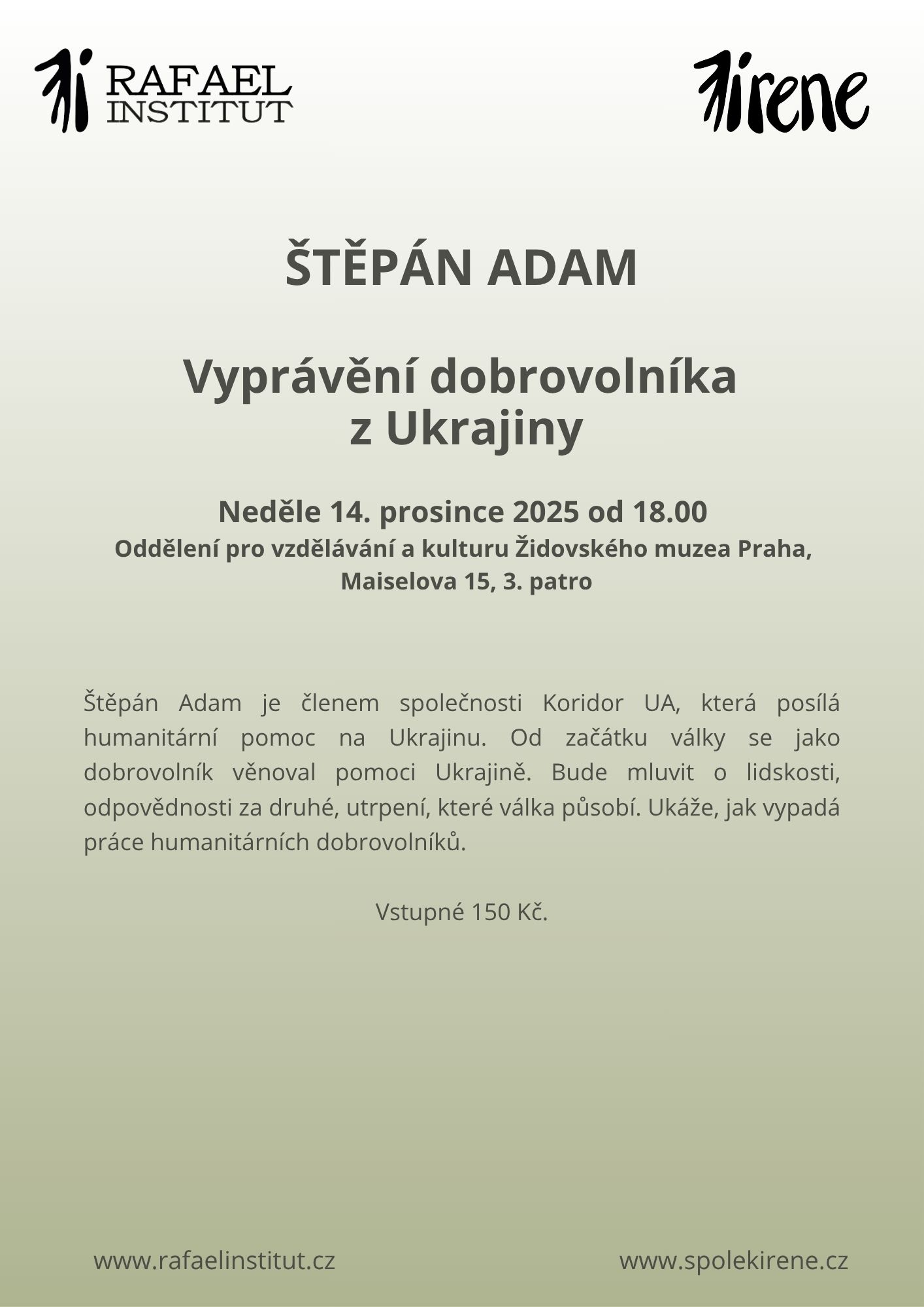 Srdečně Vás zveme na vyprávění Štěpána Adama o tom, co obnáší práce dobrovolníka neziskové organizace. Přednáškase bude konat 14. 12. 2025 v prostorách Oddělení pro vzdělávání a kulturu Židovského muzea, Praha 1, Maiselova 15, 3. patro, v 18.00.